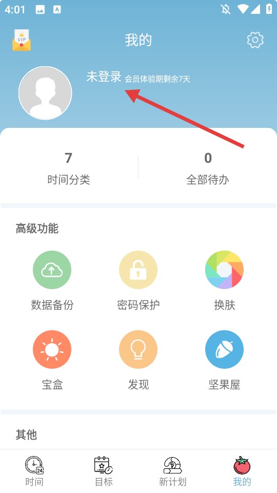 2、在“我的”页面点击“未登录”区域,进入登录界面。