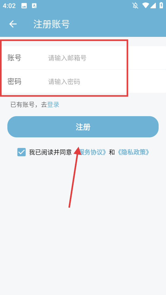 4、在注册账号页输入邮箱号和密码,点击“注册”完成操作。