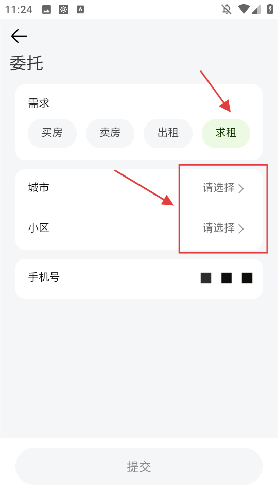 4、在委托页面,选择【求租】,填写城市、小区等信息后,点击提交,完成租房委托流程。
