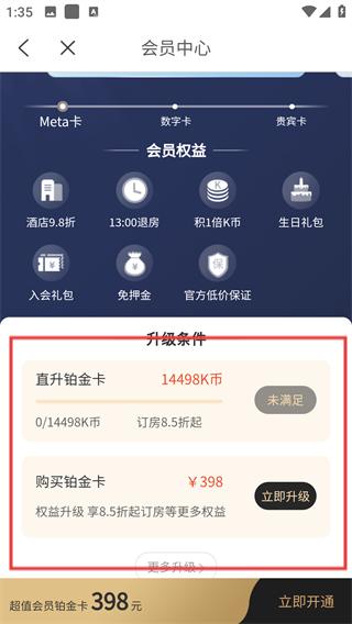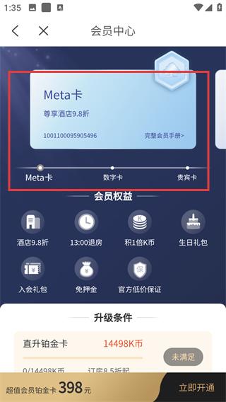 3、查看【Meta卡】权益,含酒店-9.8折、13:00-退房等,了解会员基础福利。
