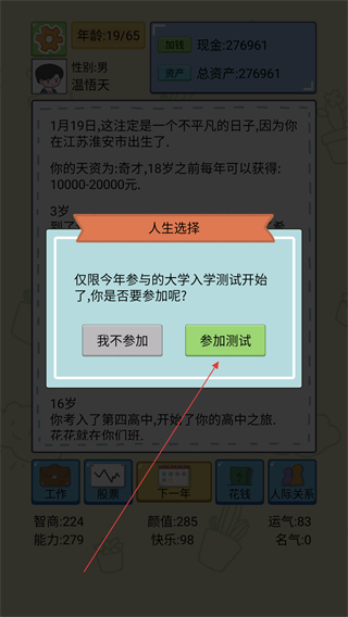 2、在人生选择中,点击【参加测试】参与大学入学测试,为后续进入大学和职业发展奠定基础。
