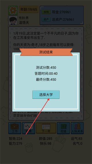 4、测试结束后,根据测试分数(如450)点击【选择大学】,推动人生历程的进一步发展。