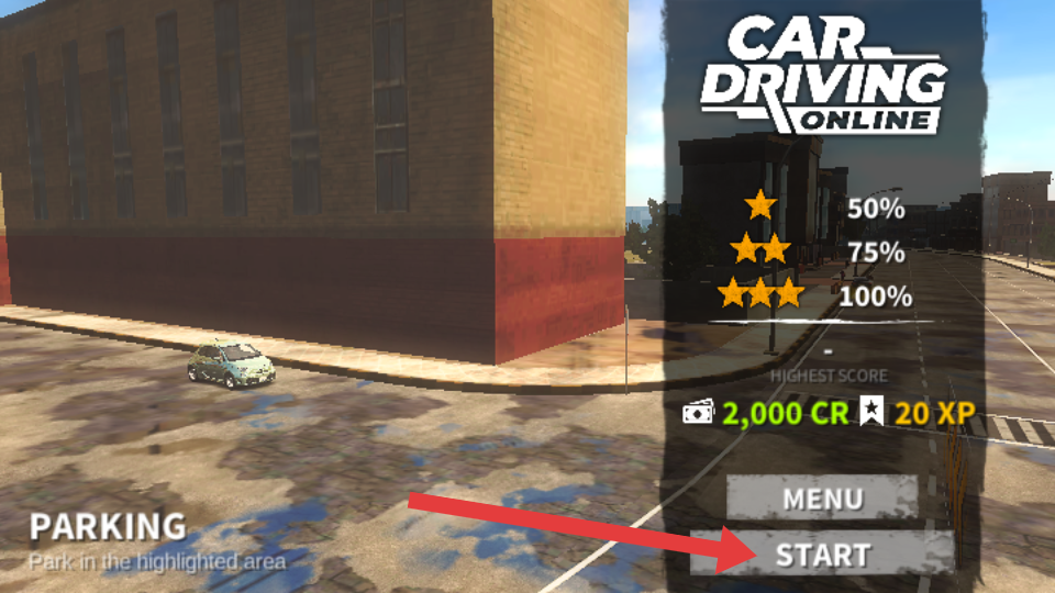 1、进入游戏后,点击【START】开始停车任务,目标是将车停到高亮区域,获取高分和奖励。