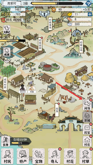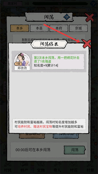 4、闯荡结束后,查看闯荡结果,了解村民知名度提升情况,继续安排村民闯荡以提升村庄发展。