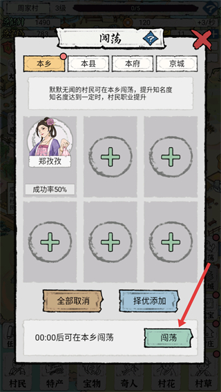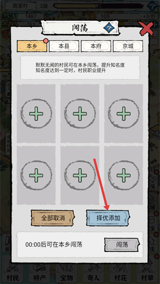 2、在闯荡界面,点击【择优添加】按钮,选择合适的村民参与本乡闯荡。