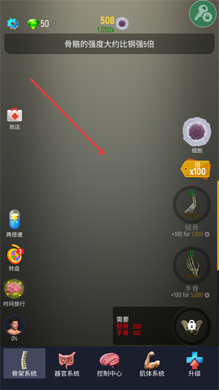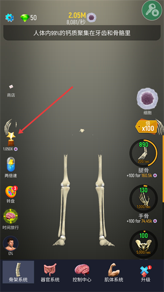 1、从左侧点击【商店】-【两倍速】等功能,优先解锁【骨架系统】,用细胞升级【腿骨】-【手骨】。