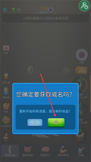 3、在确认弹窗中选择【是】,重置进度来提升每秒细胞收益,推进养成效率。