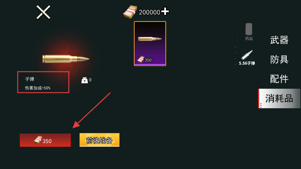 1、使用【350】货币购买【子弹-伤害加成50%】提升战力,再前往【战备】界面准备进入战场。