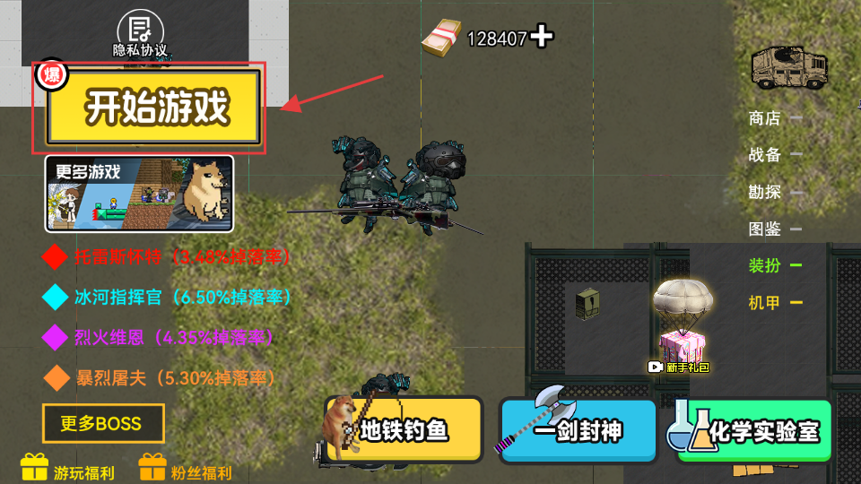 2、点击【开始游戏】按钮进入战斗场景,也可先查看【机甲】或【装扮】自定义修勾可爱外观。