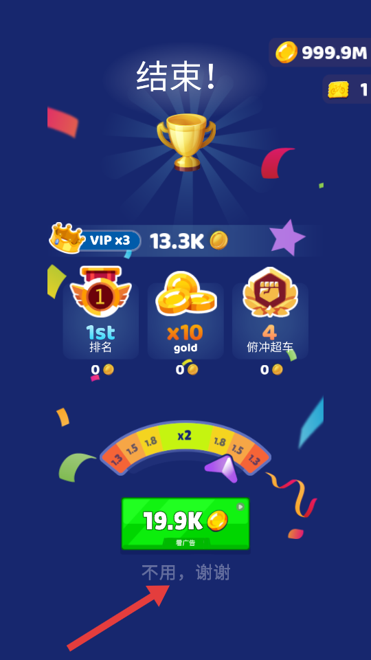4、比赛结束后,点击【不用,谢谢】领取普通奖励,积累资源用于后续升级。