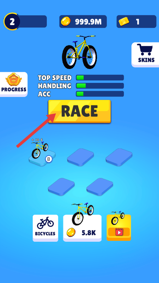 1、点击【RACE】,开始比赛,开启骑行竞赛挑战,推进游戏进程。
