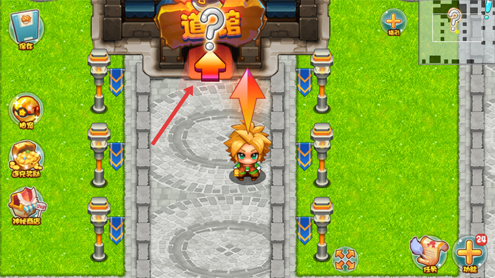 1、抵达道馆后,点击进入开启挑战,通过道馆对战提升精灵实力,推进冒险进程呀。