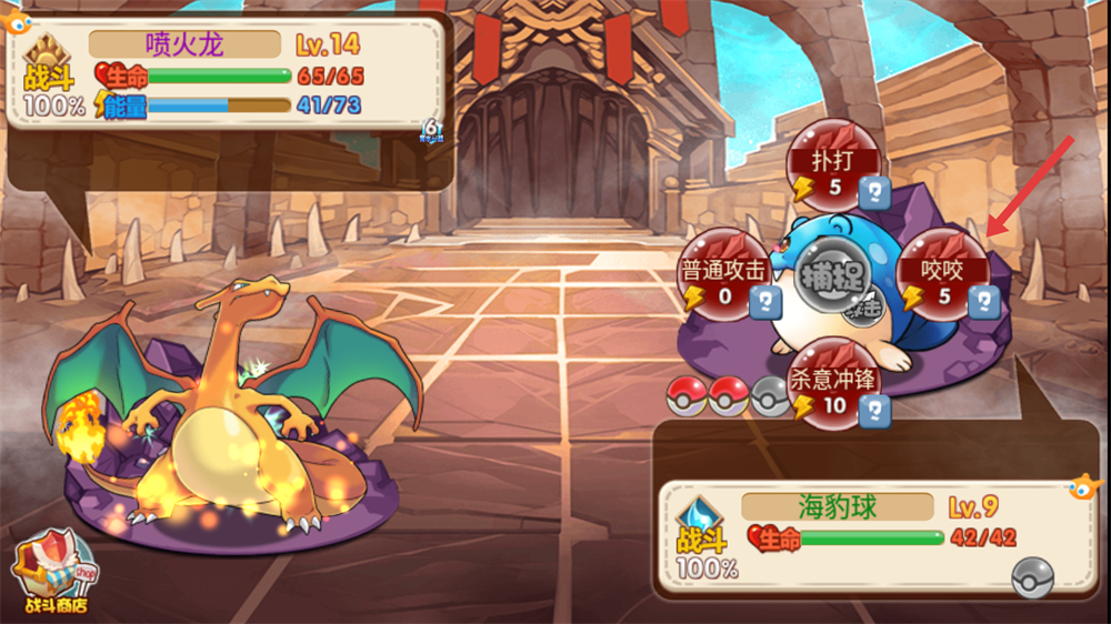 3、对战中选用【咬咬】技能,持续对敌方精灵造成伤害,为胜利加码啦。