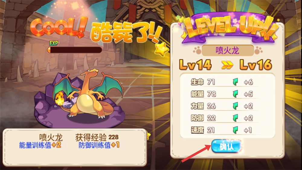 4、喷火龙升级后点击【确认】,依据新属性规划后续培养方向,让精灵更强呢。
