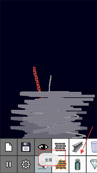 3、在工具箱中选择【金属】等材料,在沙盒中搭建金属结构,尝试不同材料的组合。