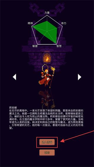 1、选择【莉安娜】角色,点击【进入游戏】按钮,开启地下魔宫冒险,解锁后续任务与伙伴养成玩法。