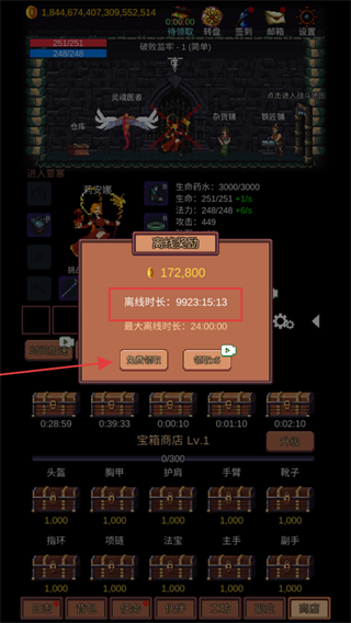 2、在离线奖励界面,点击【免费领取】按钮获取金币,或用时间加速快速领取,积累资源提升战力。