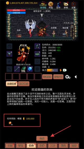 3、查看主线任务【欢迎英雄的到来】,点击【完成】按钮领取【橘猫】-【100000】金币,增强冒险助力。
