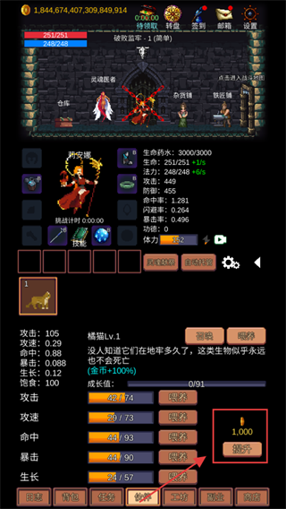 4、在伙伴界面选择【橘猫】,点击【提升】按钮消耗金币,提升其攻击属性,增强地牢战斗能力。