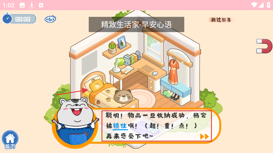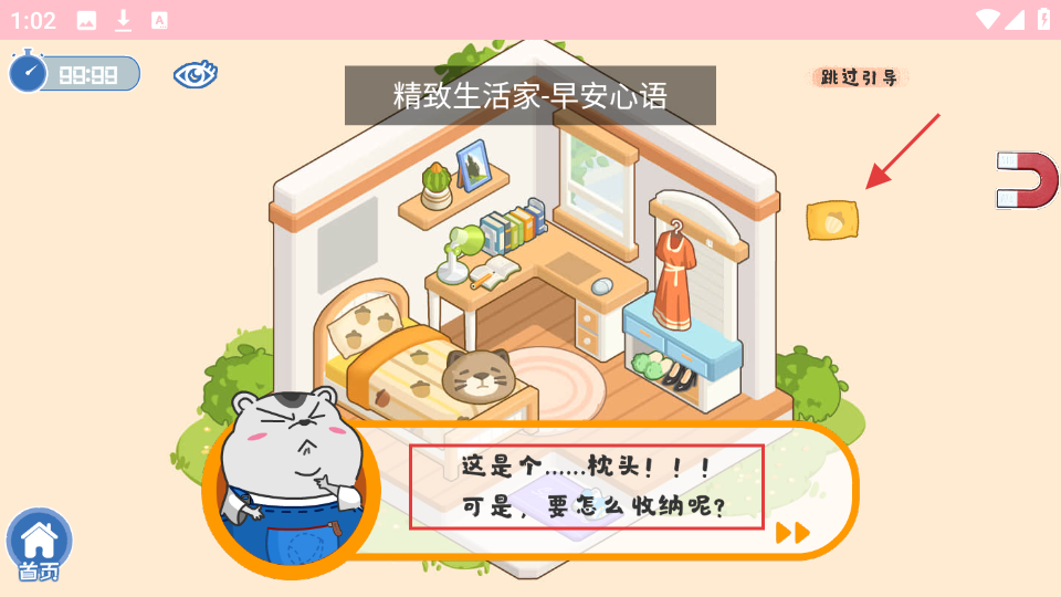 2、根据引导提示尝试将【枕头】放置到合适区域,理解收纳的基础操作逻辑与物品摆放规则。