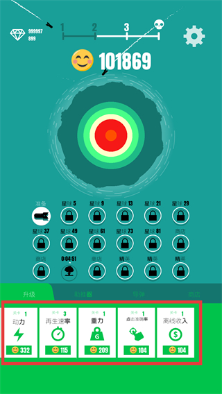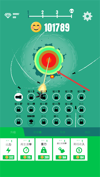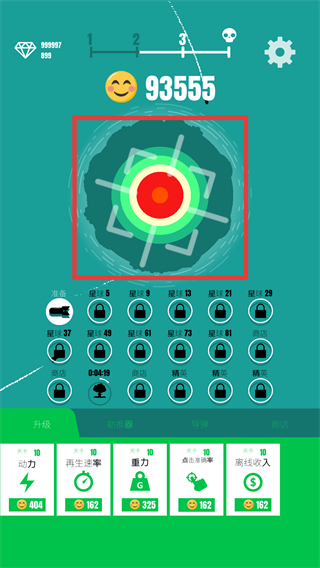 4、升级完成后,点击聚焦红框内的靶盘区域,进行大量轰炸。