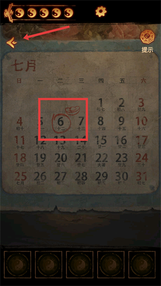 2、在日历界面中,关注红色框内的日期“6”和元宝图案,获取关键信息后点击返回箭头。