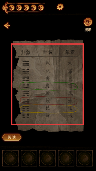 4、在垃圾桶里查看红色框内的卦象信息,根据不同颜色标记的卦象,结合游戏场景中的元素,推进解谜进程。