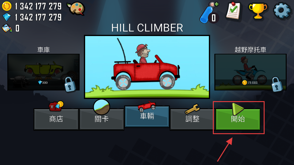 1、选好车辆后点击【開始】按钮,即可进入登山赛车的竞速闯关关卡,开启趣味驾驶挑战。