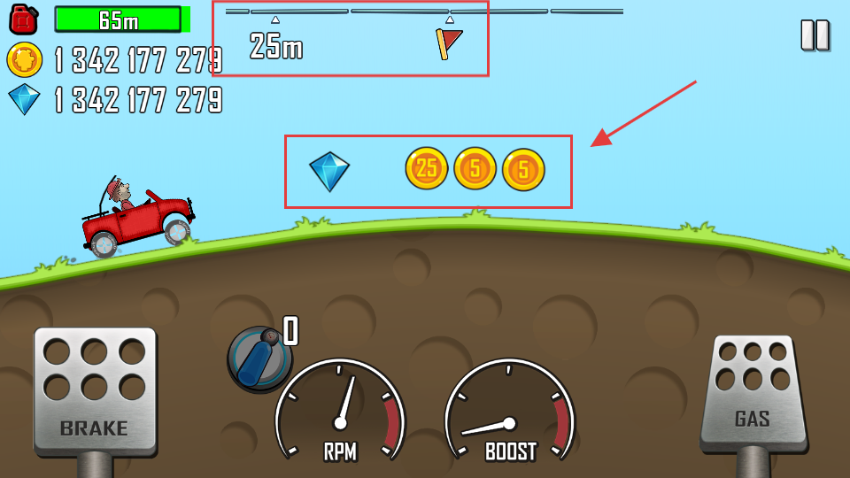 3、赛道上尽量收集【鑽石】【25】【5】【5】金币道具,同时向【25m】旗帜的目标距离冲刺。