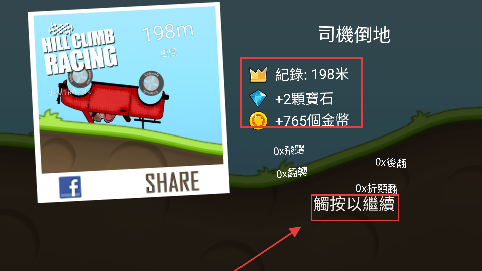 4、游戏结束后查看【198米】记录与【+2顆寶石】【+765個金幣】奖励,触碰继续按钮重玩。