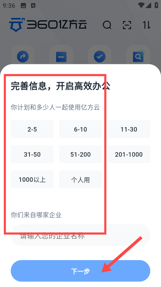 4、在完善信息页面,选择使用人数范围等信息,点击【下一步】,完成账号注册。