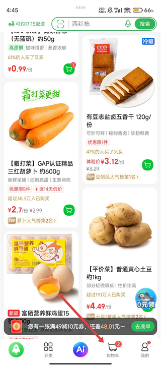 1、打开叮咚买菜软件,点击底部【购物车】,进入购物车页面哦。