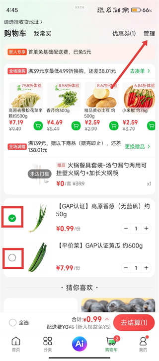 2、在购物车页面,点击右上角【管理】,进入商品管理模式。