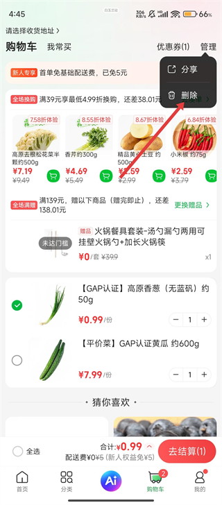 3、进入管理模式后,点击【删除】选项,可对勾选商品进行删除操作,让购物车更整洁哟。