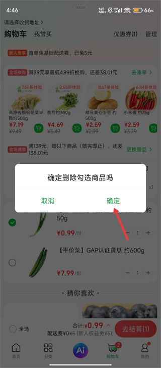 4、在弹出的确认框中,点击【确定】即可删除勾选商品,轻松完成购物车清除操作啦。