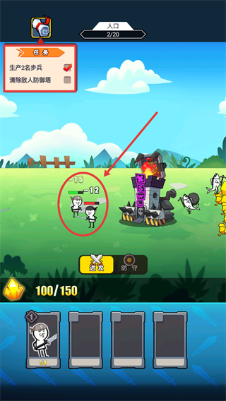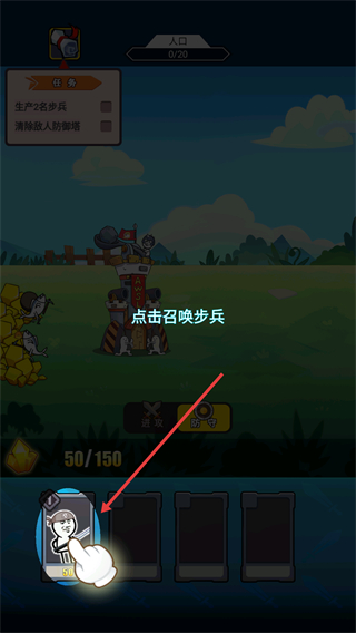 2、在战斗界面点击【步兵】卡牌,消耗资源召唤步兵单位,完成“生产2名步兵”的任务目标。