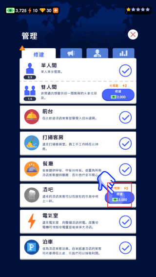 4、在管理界面升级酒吧,提升酒吧等级,完善酒店设施,助力酒店发展。