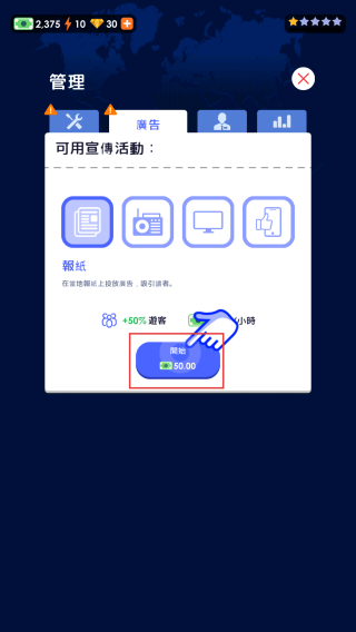 3、在管理界面开启报纸宣传活动,增加游客数量,提升酒店客流量。