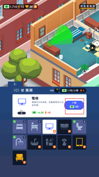 2、在装修房界面升级电视,提升房间设施功能,增加收益和顾客满意度。