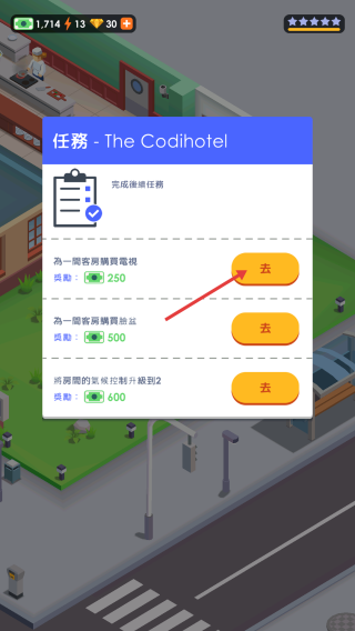 1、在任务界面点击【去】,完成为顾客购买电视等任务,获取金币奖励,积累资源。