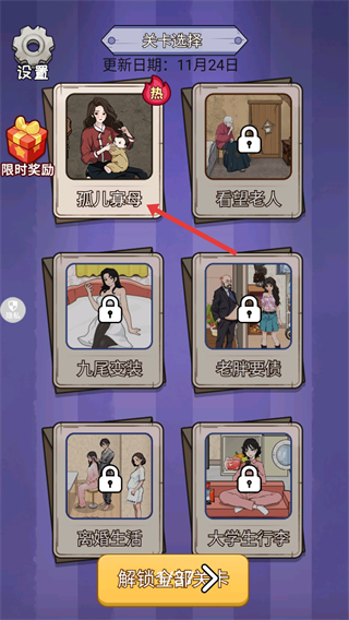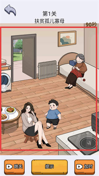 1、在关卡选择界面,点击【孤儿寡母】关卡,进入第1关扶贫孤儿寡母的找茬挑战。