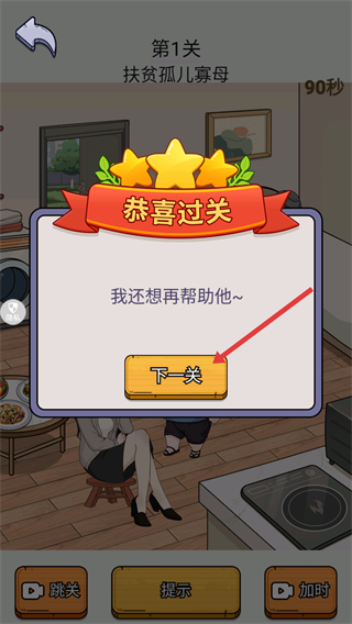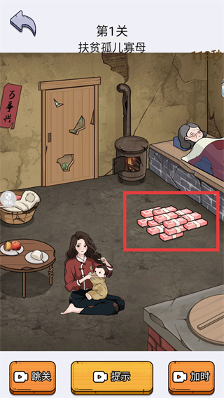 2、在第1关场景中,使用方框内钞票对场景进行扶贫。