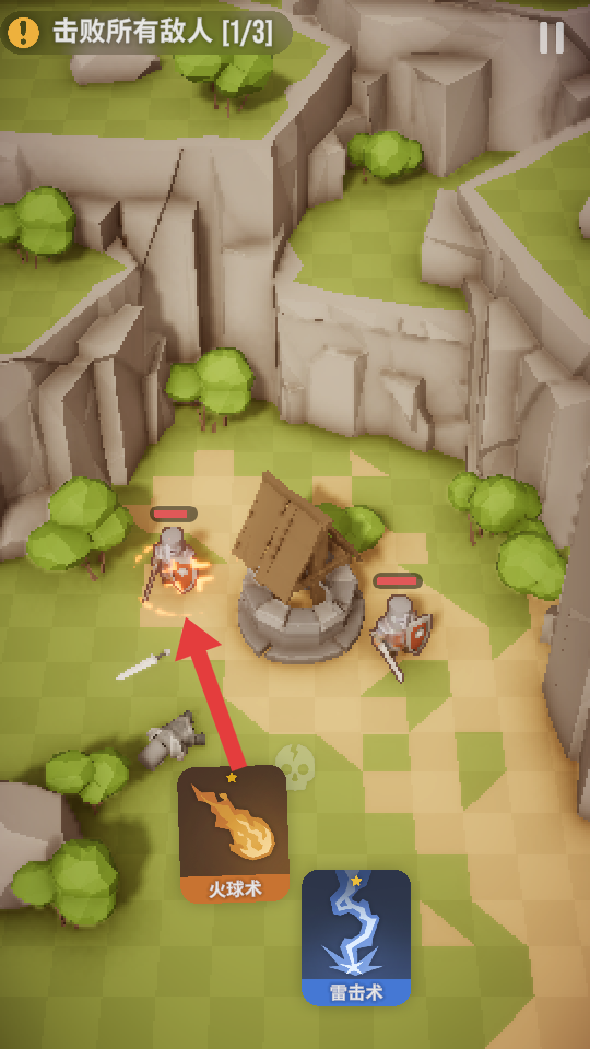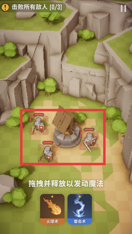 2、进入关卡后,面对【红框内的敌人】,根据屏幕提示,拖拽并释放【火球术】或【雷击术】魔法来攻击敌人。