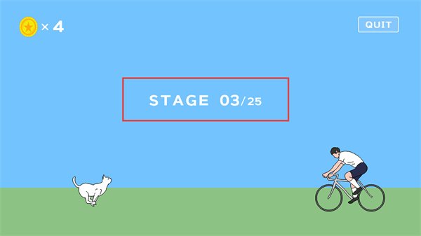 1、进入“Stage03/25”关卡,开启第三关的跨栏挑战,场景中有猫咪、骑自行车的人物和金币元素。