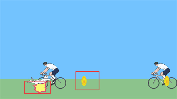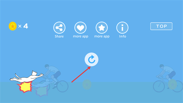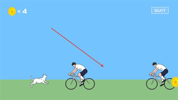 2、操作猫咪跳跃,避开骑自行车的人物,同时收集金币,需掌握跳跃时机,确保猫咪顺利通过障碍。