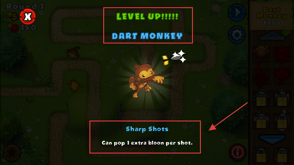 1、升级【DartMonkey】到【SharpShots】,每次射击可多爆一个气球,能有效增强前期对气球的防御能力。