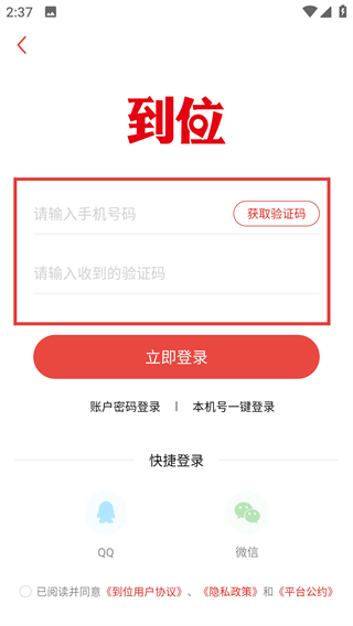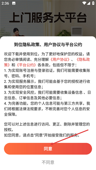 1、打开到位APP,在隐私政策页面点击【同意】,进入登录界面。