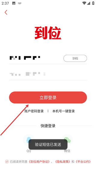 3、填写收到的短信验证码,勾选“已阅读并同意”协议后,点击【立即登录】。