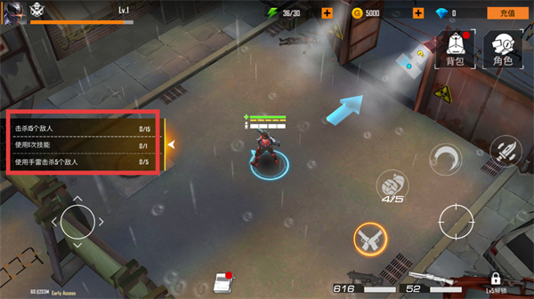 1、进入关卡后,查看红色框内的任务目标,包括【击杀5个敌人】【使用1次技能】等,按目标推进战斗。