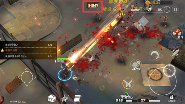 3、注意红色框内的倒计时【0:01:17】,在时间限制内高效清理丧尸,确保完成关卡任务。